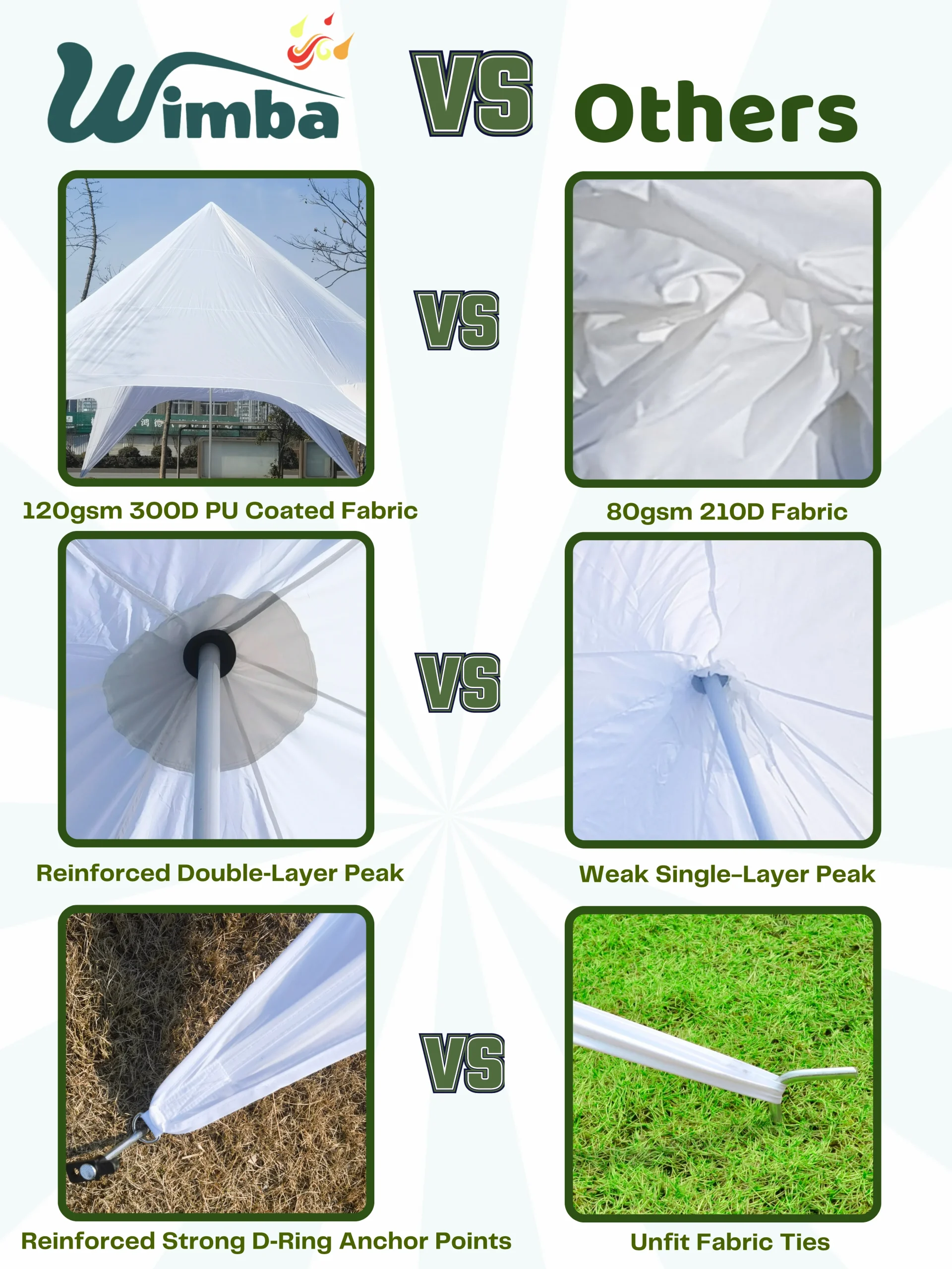 | Stretch Tents are intended for events and other arrangements and are as such only meant for short term temporary assembly and disassembly. Wimba warranty applies only to the normal use of the product, normal wear and tear excepted, in accordance with written use instructions or manual. The warranty does not apply to damage caused by accident, abuse, weather conditions, misuse, modification or incorrect dismantle, erection, packing and storage of the product. |