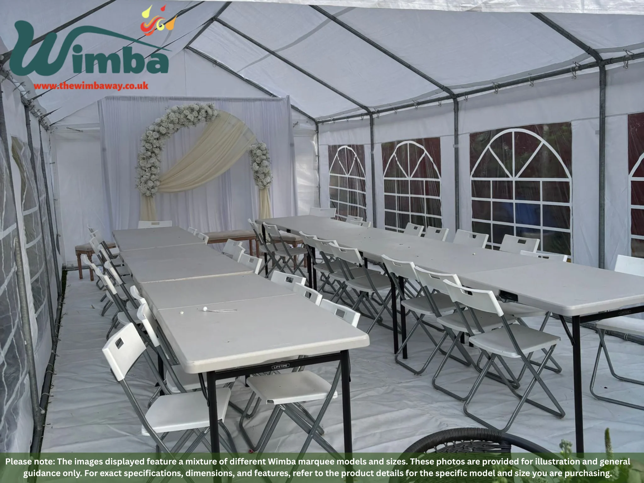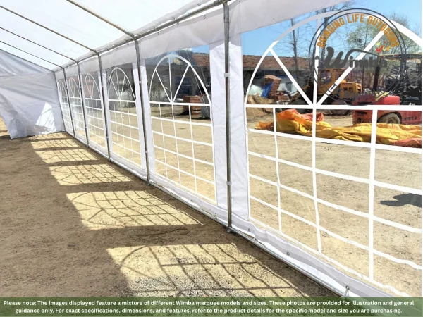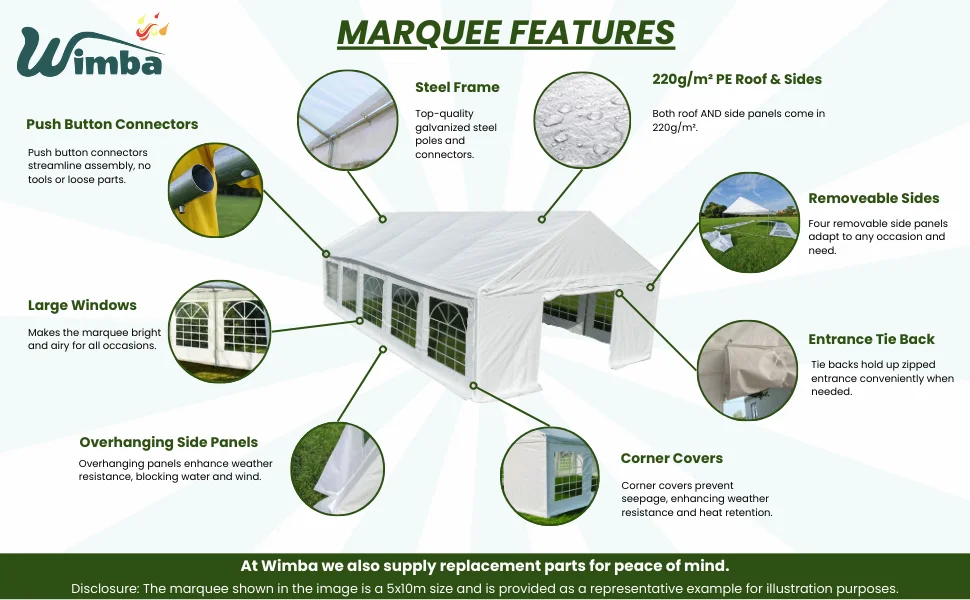 | We would like to inform you that while our PE marquees are weatherproof, they may experience condensation droplets on the inside of the roof when used in cold weather. Additionally, during periods of excessive heavy rain, there may be water leaks on the sides where the stitching is located. |