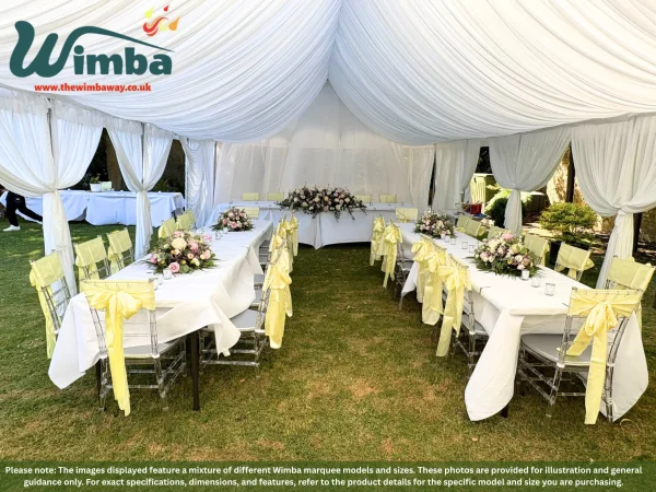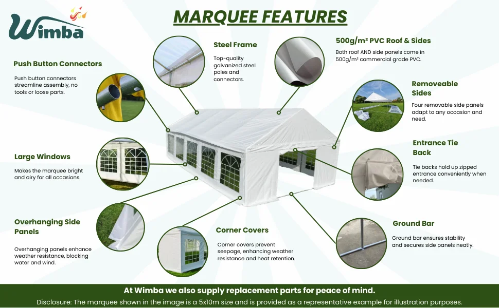 | Marquees are intended for events and other arrangements and are as such only meant for short term temporary assembly and disassembly. Wimba warranty applies only to the normal use of the product, normal wear and tear excepted, in accordance with written use instructions or manual. The warranty does not apply to damage caused by accident, abuse, weather conditions, misuse, modification or incorrect dismantle, erection, packing and storage of the product. |