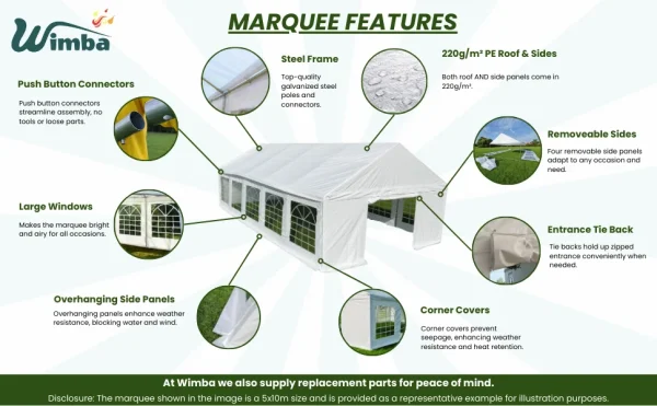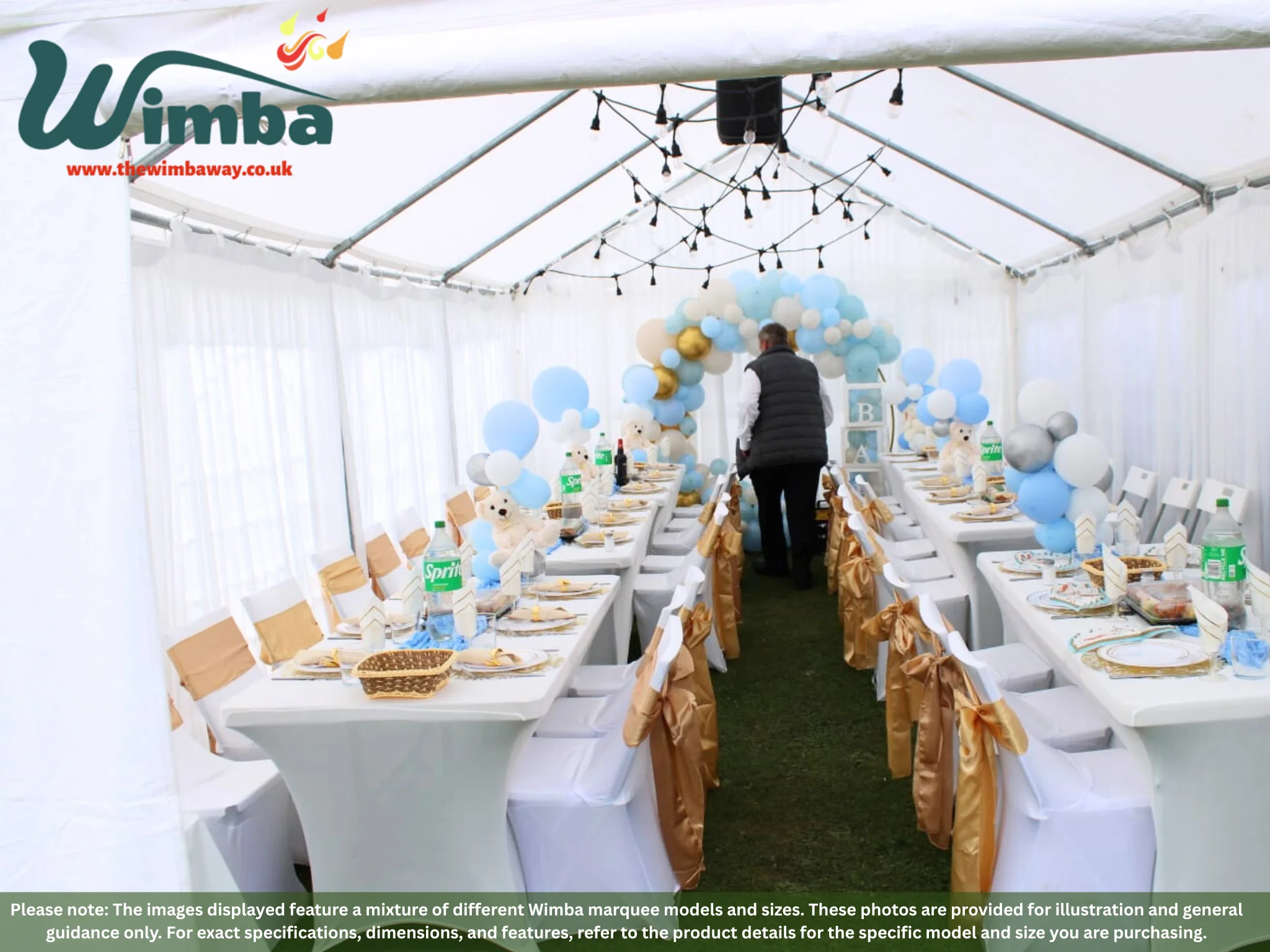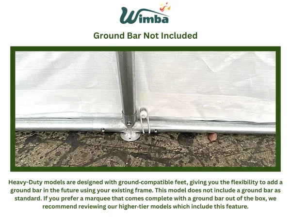 | Marquees are intended for events and other arrangements and are as such only meant for short term temporary assembly and disassembly. Wimba warranty applies only to the normal use of the product, normal wear and tear excepted, in accordance with written use instructions or manual. The warranty does not apply to damage caused by accident, abuse, weather conditions, misuse, modification or incorrect dismantle, erection, packing and storage of the product. |