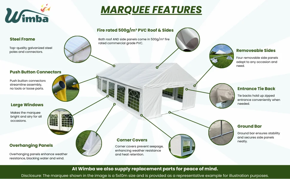 • Usage: Marquees are intended for events and other arrangements and are as such only meant for short term temporary assembly and disassembly.