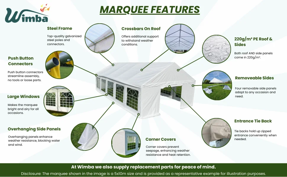 | Marquees are intended for events and other arrangements and are as such only meant for short term temporary assembly and disassembly. Wimba warranty applies only to the normal use of the product, normal wear and tear excepted, in accordance with written use instructions or manual. The warranty does not apply to damage caused by accident, abuse, weather conditions, misuse, modification or incorrect dismantle, erection, packing and storage of the product. |