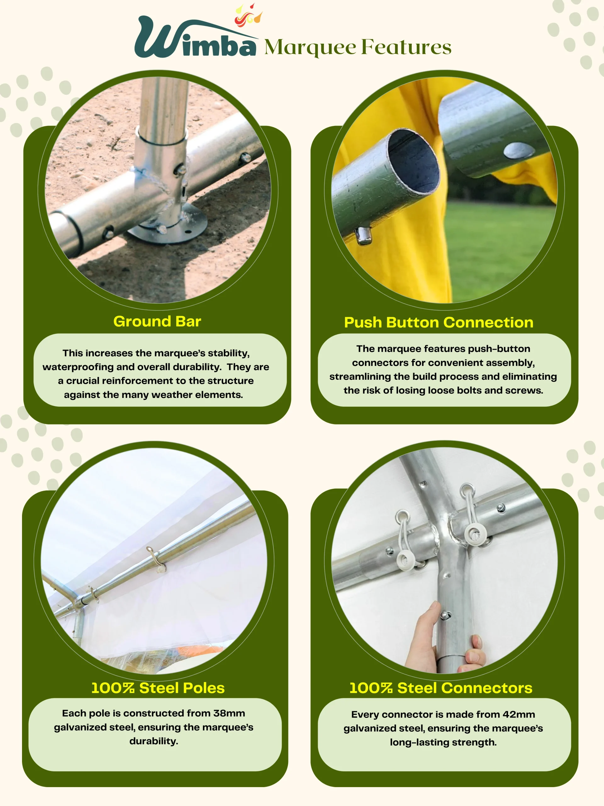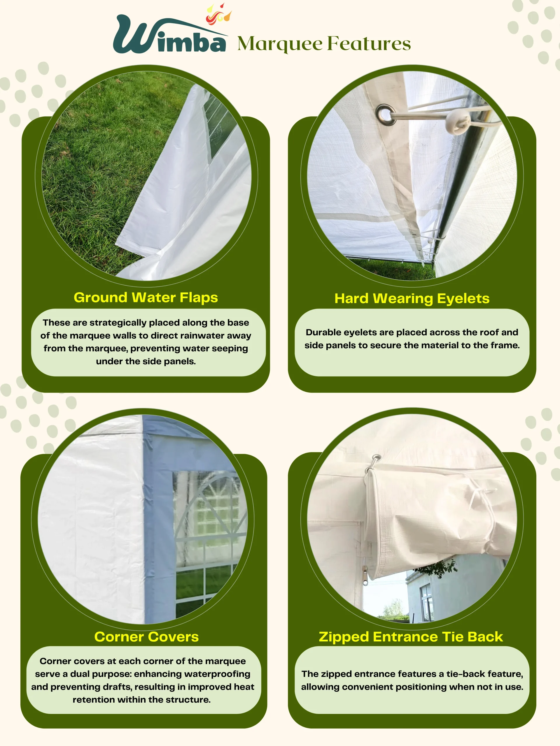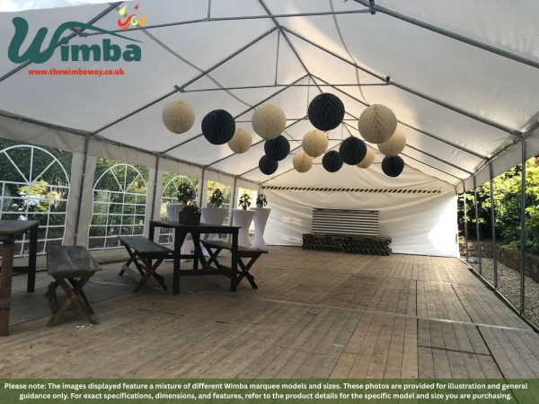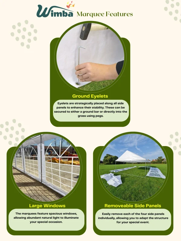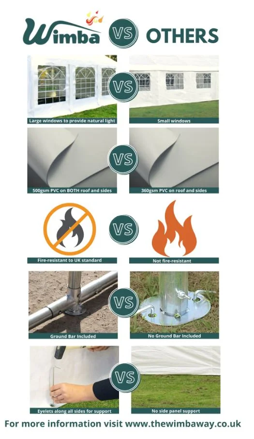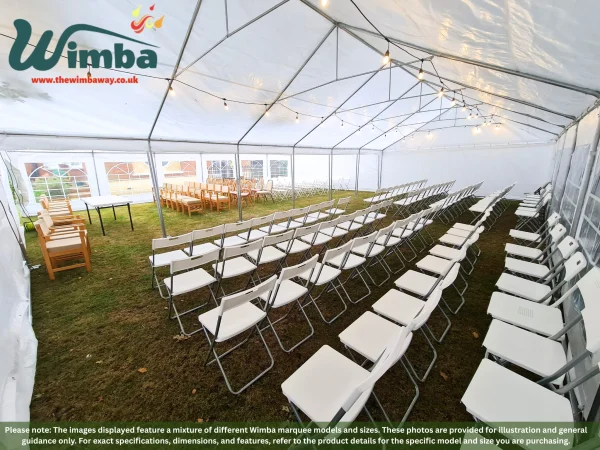 | Marquees are intended for events and other arrangements and are as such only meant for short term temporary assembly and disassembly. Wimba warranty applies only to the normal use of the product, normal wear and tear excepted, in accordance with written use instructions or manual. The warranty does not apply to damage caused by accident, abuse, weather conditions, misuse, modification or incorrect dismantle, erection, packing and storage of the product. |